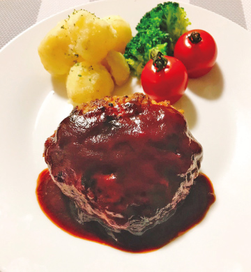 6. ハンバーグを盛り付け、ジャガイモ、ブロッコリー、トマトを添える。